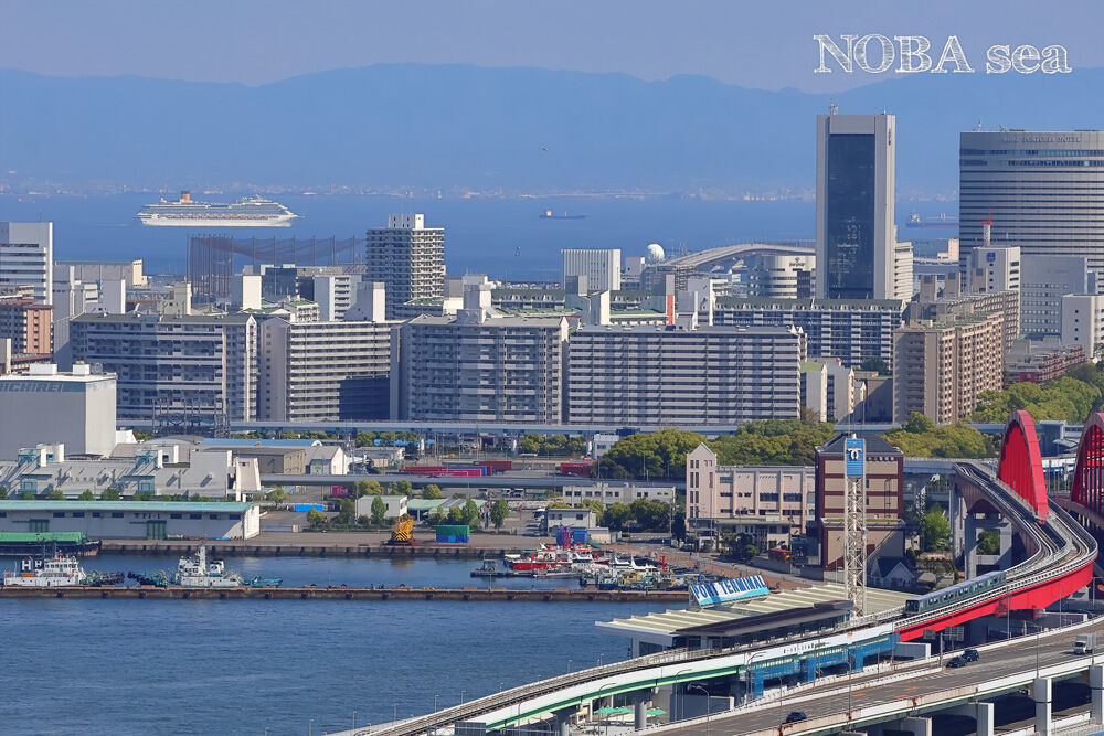 沖合を行くコスタ・セレーナと、ポートライナーの