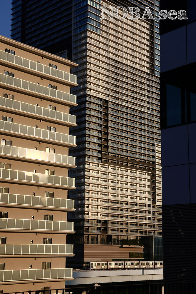 巨大なビル群からすると、めちゃくちゃ小型な輸送機関ですね、